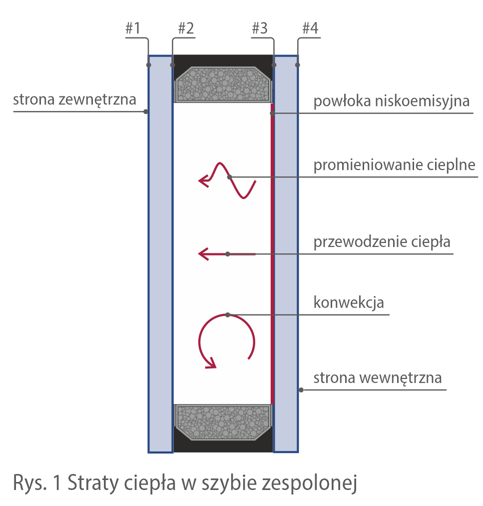 Istnieją trzy rodzaje wymiany ciepła: promieniowanie cieplne, przewodzenie ciepła i konwekcja (rys. 1). W przypadku okien dwuszybowych, zbudowanych ze szkła niepowlekanego, promieniowanie cieplne stanowi ok. 50 proc. przepływu ciepła, podczas gdy przewodzenie i konwekcja stanowią po ok. 25 proc. Przy zastosowaniu szyby z powłoką o niskiej emisyjności cieplnej (low-E), straty ciepła przez promieniowanie są znacznie ograniczone (spadek nawet o 98 proc.). W rezultacie przewodzenie ciepła i konwekcja stają się główną przyczyną strat ciepła. Rozwiązaniem jest zastosowanie gazu szlachetnego o niskiej przewodności, który poprawia właściwości izolacyjne.