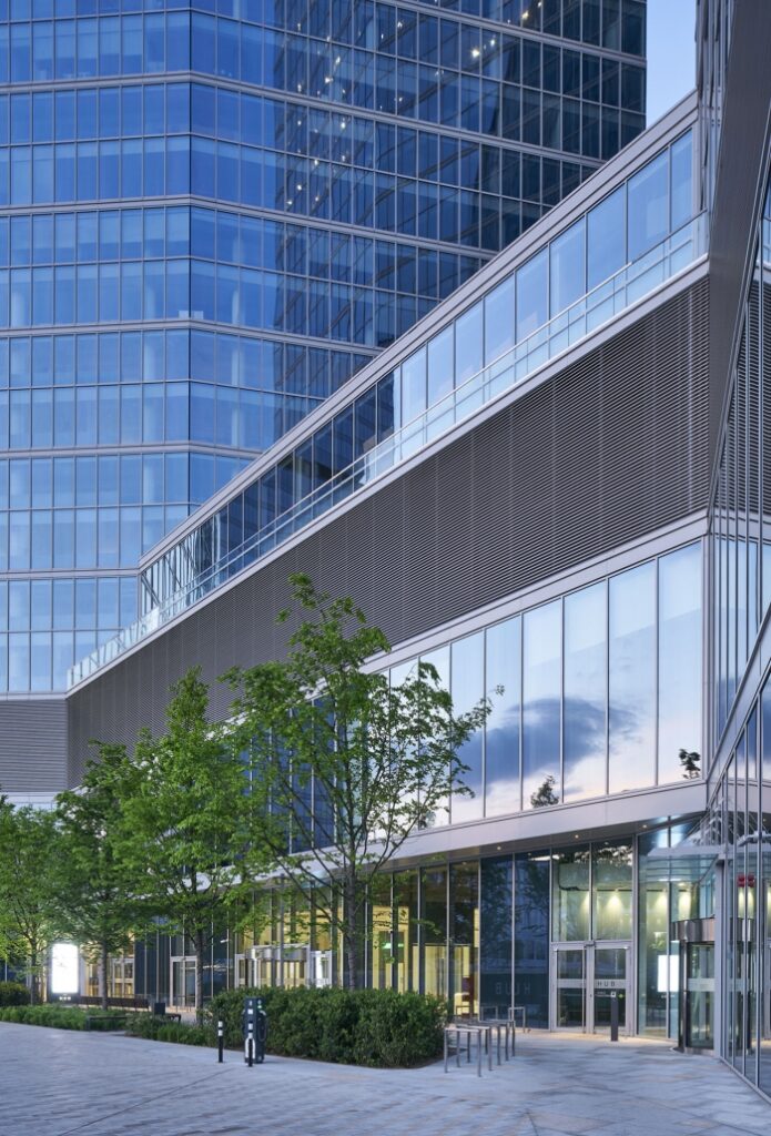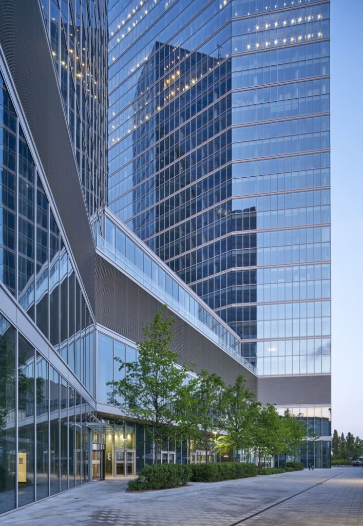 Fasada obu wież została zrealizowana w systemie szklenia elementowego, gdzie gotowe elementy aluminiowe wraz z szybami zespolonymi były dostarczane przez przetwórcę z zakładu produkcyjnego na miejsce budowy i montowane bezpośrednio w fasadę budynku. Na obu wieżach zastosowano szyby zespolone dwukomorowe z powłoką przeciwsłoneczną typu Stopray Vision 60 T, ograniczającą ilość światła i energii latem oraz utrzymującą ciepło w budynku zimą. Dla przeszkleń na poziomie 0 i 1 obu wież dostarczyliśmy około 5,3 tys. m2 szyb dwukomorowych o dużych gabarytach wysokich na blisko 5,7 m. Trzeci budynek (najmniejszy) został wykonany w systemie okien aluminiowych. Na potrzeby wykonania przeszkleń tego budynku wyprodukowaliśmy 2,7 tys. m2 wielkogabarytowych wysokich na blisko 3 m szyb zespolonych dwukomorowych o tych samych parametrach spektofotometrycznych jak w przypadku wież.