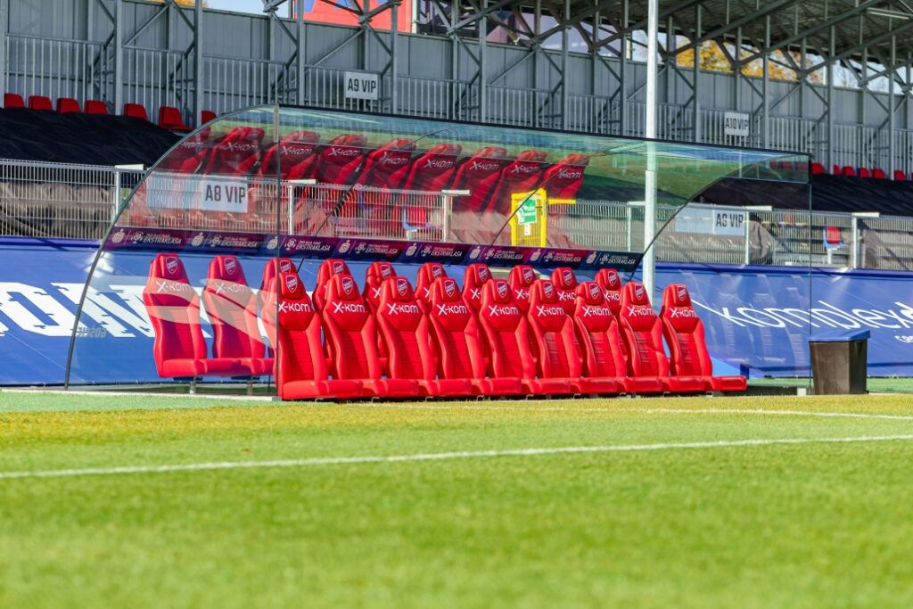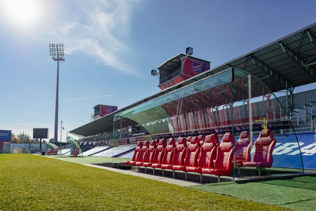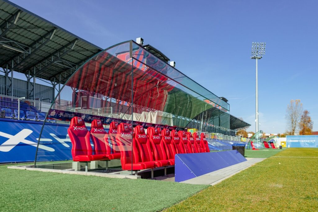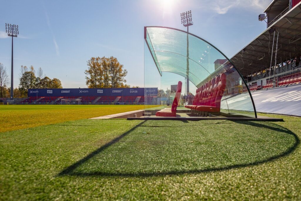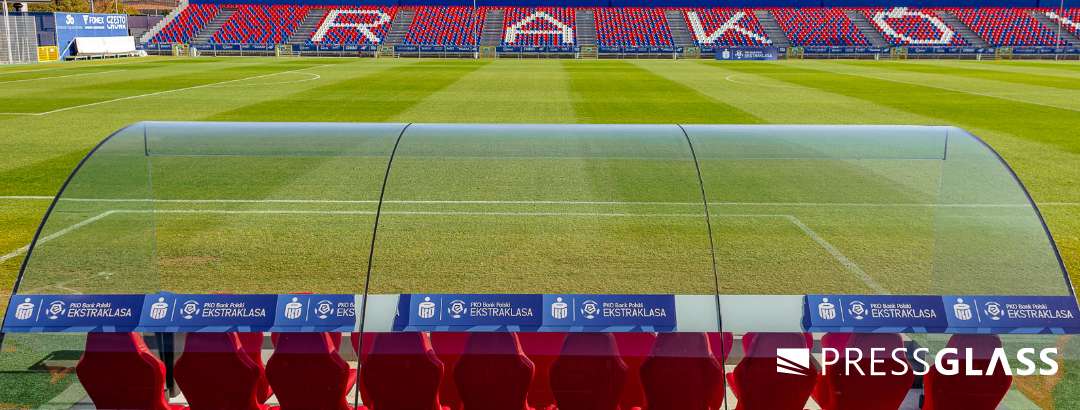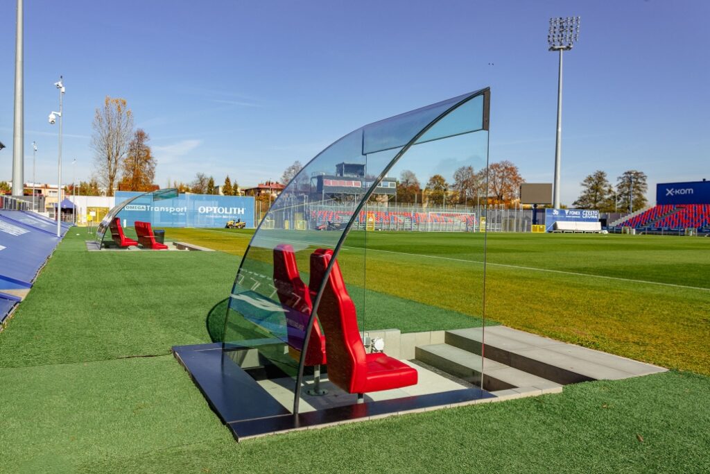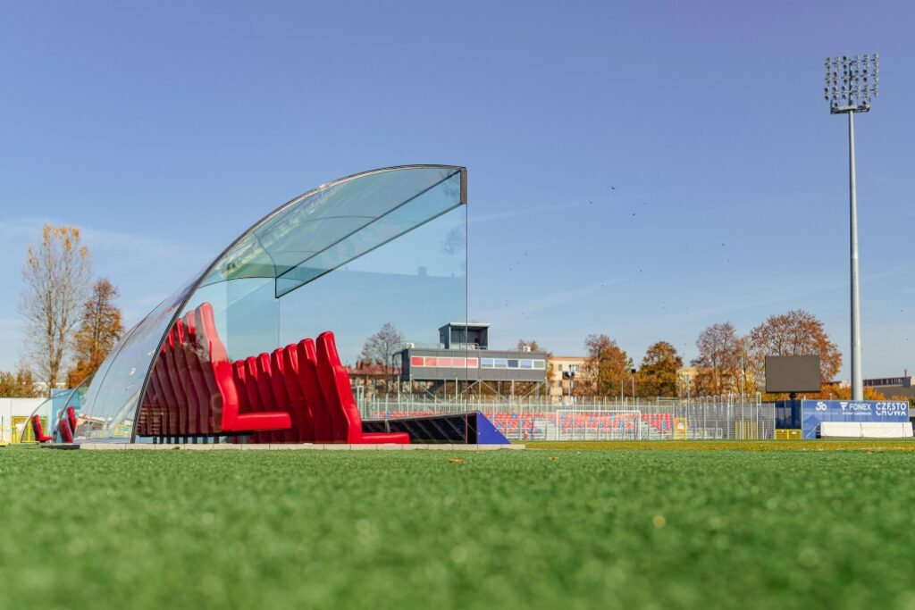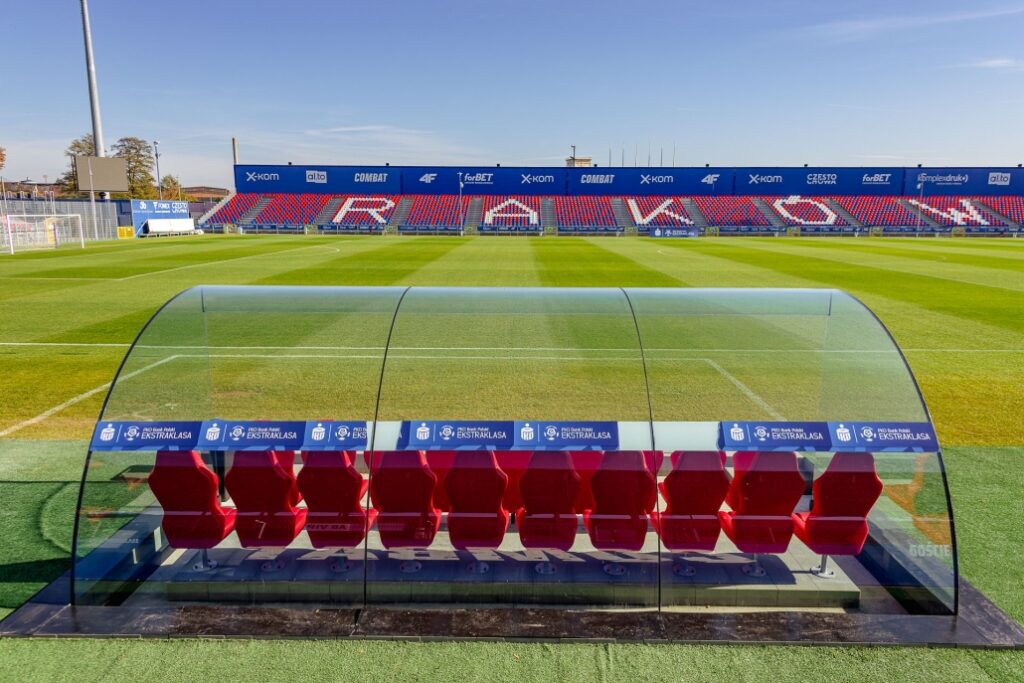 W ramach współpracy z klubem piłkarskim RKS Raków Częstochowa wykonaliśmy szklane zadaszenia ławek dla sztabu szkoleniowego oraz zawodników rezerwowych.