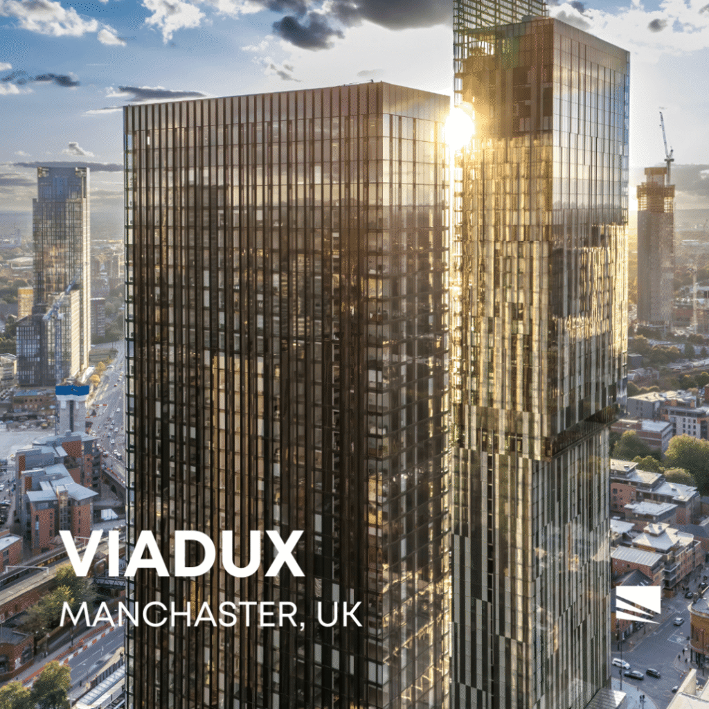 Viadux to wyjątkowy budynek mieszkalny zlokalizowany w samym sercu Manchesteru. Zaprojektowany przez studio SimpsonHaugh, łączy nowoczesność z historycznym charakterem miasta. Jego imponująca szklana fasada o powierzchni 13 851 m² wykorzystuje szkło przetworzone przez PRESS GLASS. Na zdjęciach można zobaczyć, jak prezentuje się ona w różnych porach dnia.